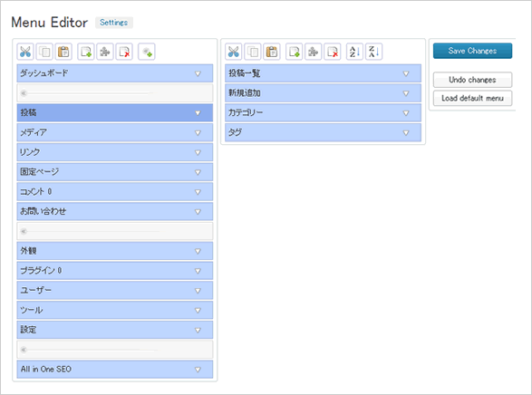 この画面からサイドバーのメニューのカスタマイズができます。