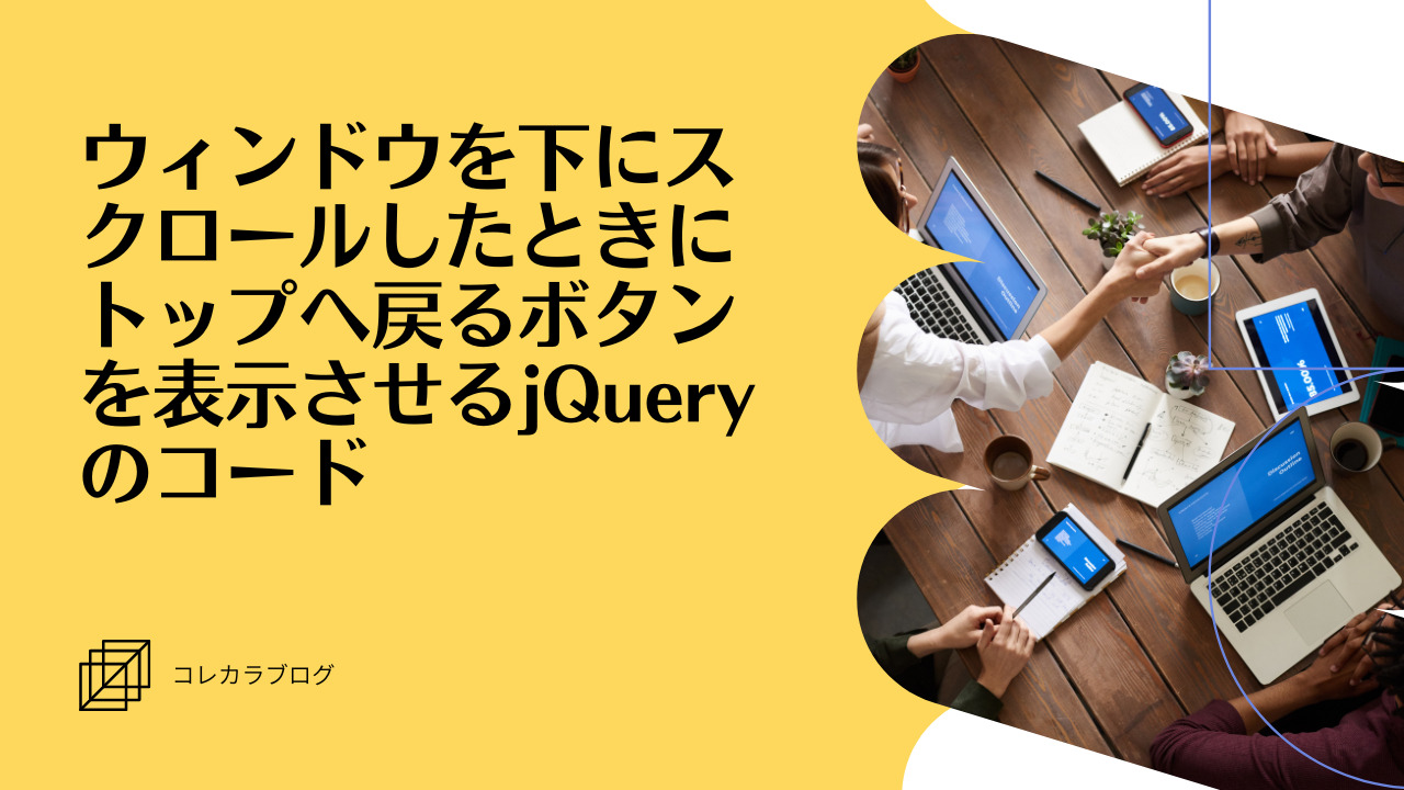 画面を下にスクロールすると矢印のボタンが「にゅ~」っと表示されます。大まかに説明すると、アニメーション部分はjQuery、ボタンのレイアウト、配置はCSSでやっています。まずはボタンを実装したいページにjQueryの本体を読み込みます。