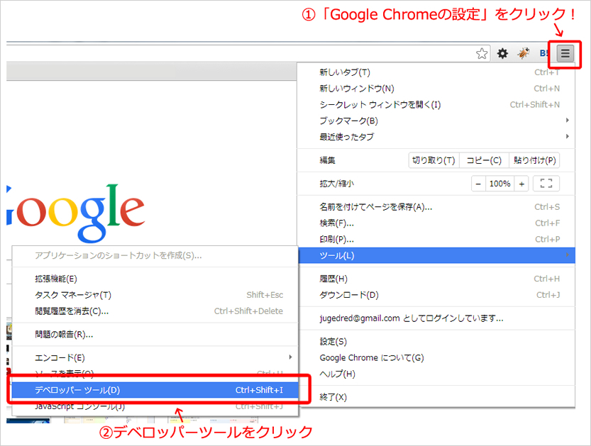 そのまま「ツール」→「デベロッパーツール」のメニューをクリックします。