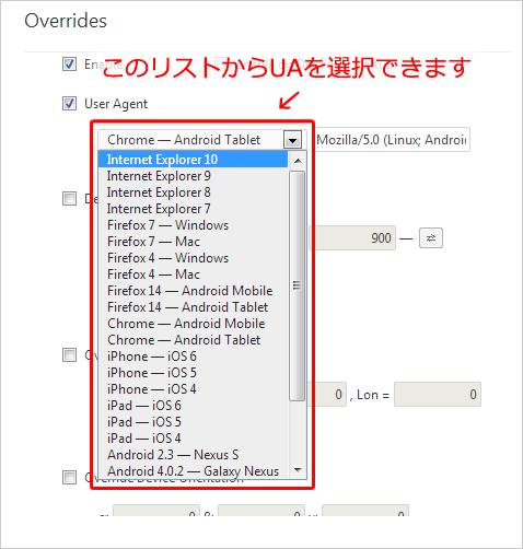 そうすると少し下にあるコンボボックスからUserAgentが選択できるようになります。