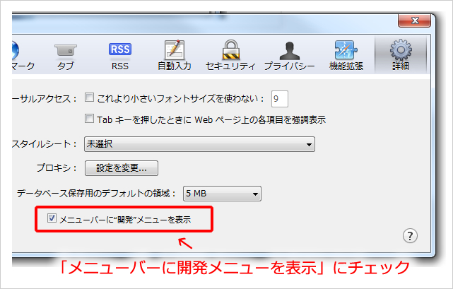 設定画面の「詳細」タブを選択し、「メニューバーに開発メニューを表示」にチェックを入れます。