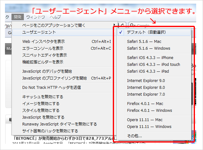 それでは次にSafariでのUserAgentの設定方法を紹介します。