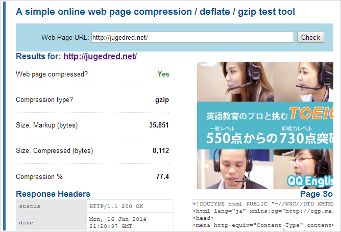 「Web page compressed?」の部分に「Yes」と書いてあればgzip圧縮が有効になっています。