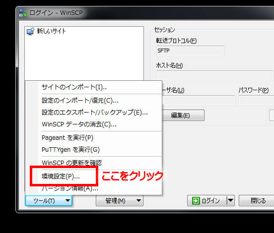 WinSCPで隠しファイルを表示させる設定は「環境設定」メニューからできます。