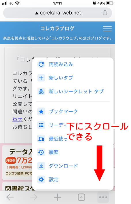 そうすると右下からブラウザのメニューが表示されます。実はこのメニューは下にスクロールできるようになっています。そこで下にスクロールさせましょう。