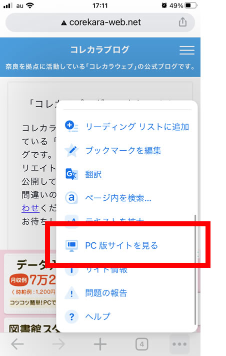 これで「PC版サイトを見る」のメニューが表示されます。これをクリックするとiPhoneのGoogle Chromeのユーザーエージェント(User Agent)がPCの文字列となり、iPhoneのGoogle ChromeでPC版サイトの閲覧ができるようになります。