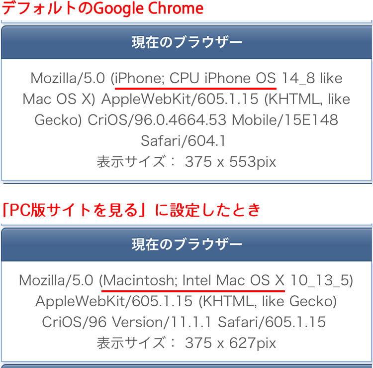 デフォルトのiPhone Google Chromeと「PC版サイトを見る」に設定したときのユーザーエージェントの文字列に違いがあることがお分かりでしょうか。「PC版サイトを見る」の状態では、ユーザーエージェントに「iPhone」という単語がなく、「Macintosh」が表示されています。これにより「PC版サイトを見る」の状態では、iPhoneではなくMac OS(パソコン)を使っているとWebサイトに通知するわけです。
