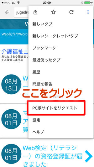 これで「PC版サイトを見る」のメニューが表示されます。これをクリックするとiPhoneのGoogle Chromeのユーザーエージェント(User Agent)がPCの文字列となり、iPhoneのGoogle ChromeでPC版サイトの閲覧ができるようになります。