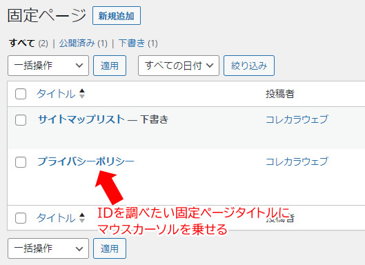 IDを調べたい固定ページのタイトルにマスウカーソルを持ってきます。