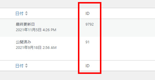 使用しているテーマによっては、固定ページ一覧のカラムに「ID」が表示されているかもしれません。その場合は表示されている数値をそのまま使うと良いでしょう。