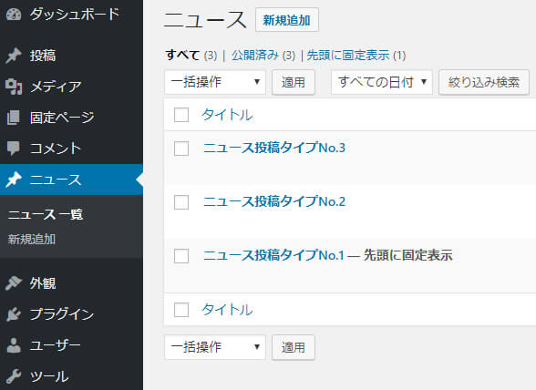 今回は「ニュース」というカスタム投稿タイプを作り、一番最初の記事を固定させてみます。