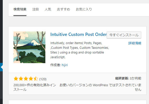 プラグインの管理画面から「Intuitive Custom Post Order」を検索します。