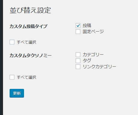 並び替えをしたい項目にチェックを入れて「更新」ボタンをクリックします。カスタム投稿タイプにも対応しています。