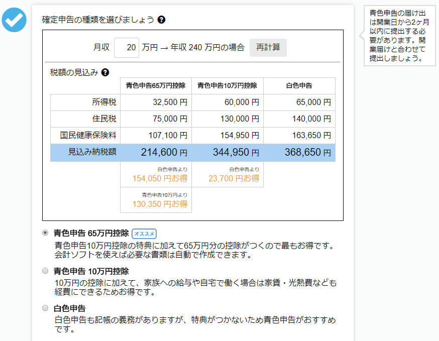 開業届には収入を記載する項目はありませんが、後のページで税金額を計算してくれる機能があるので、そのために入力します。ざっくりでいいです。