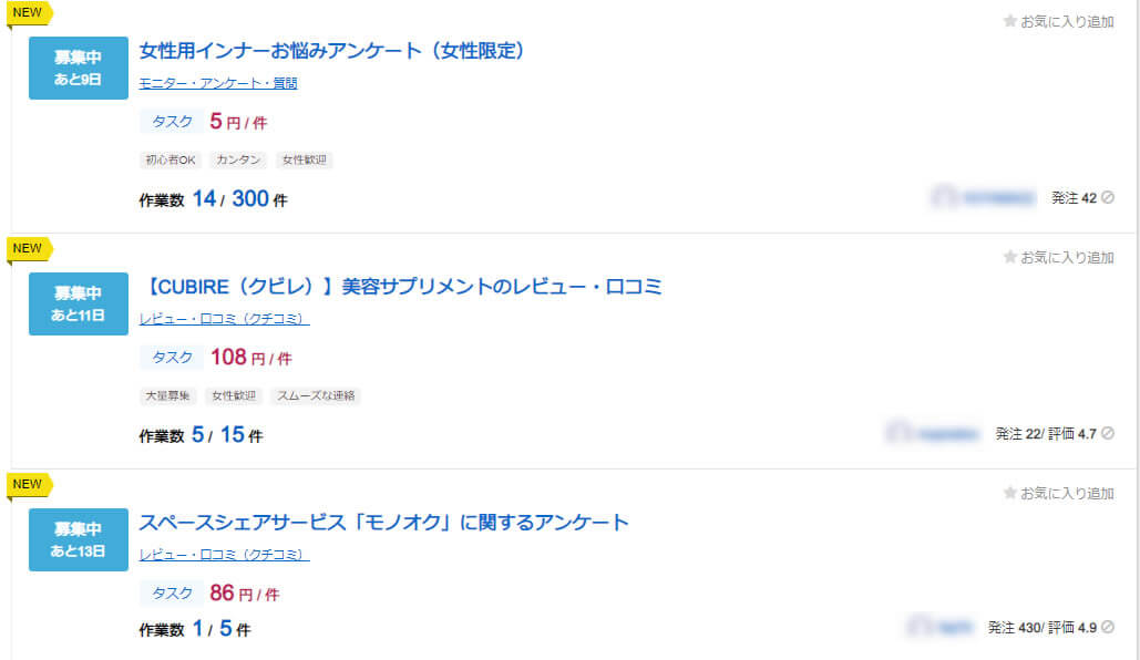 しかしアンケートやレビューなど簡単にできるお仕事ばかりなので、クラウドソーシングでお仕事を始めたばかりの人は、まず簡単なタスクから挑戦する人が多いです。
