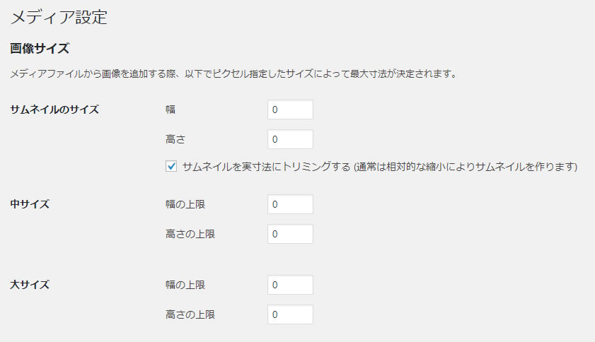 これで「メディア設定」の画像サイズが全て「0」になりました。次回から画像をアップロードすると、メディア設定の画像については自動生成されなくなります。