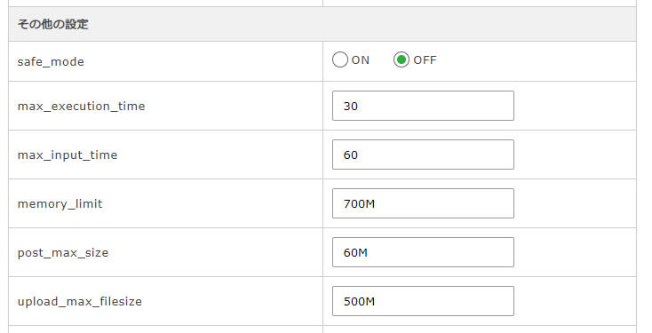 | max_input_time | PHPがPOST、GETを処理する最大時間(秒) |
