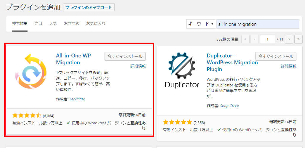 「プラグインを追加」画面から「All-in-One WP Migration」を検索してインストールします。
