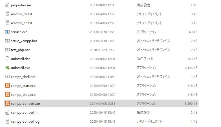 XAMPPをインストールしているフォルダを開き「xampp-control.exe」を右クリックして、プロパティを開きます。
