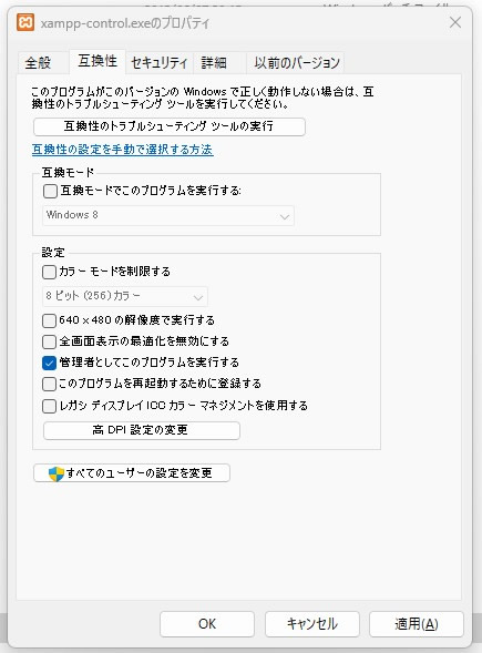 この設定で次回からXAMPPが管理者権限で動作します。これでXAMPP終了時にエラーが発生しなくなります。