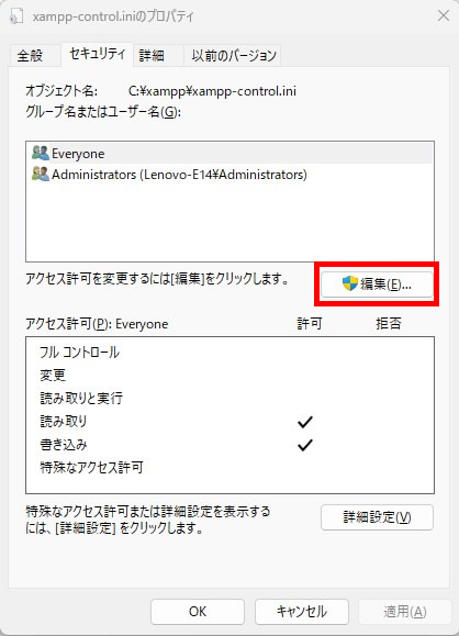 【方法2】「xampp-control.ini」に書き込み権限を与える