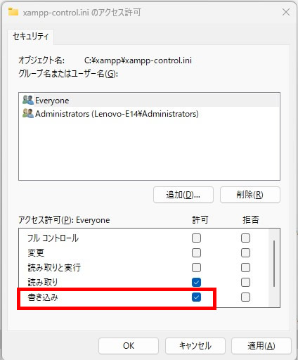 「アクセスの許可」から「書き込み」にチェックをいれてOKボタンをクリックします。これで「xampp-control.ini」に書き込み権限が付与され、XAMPP終了時にエラーが発生しなくなります。