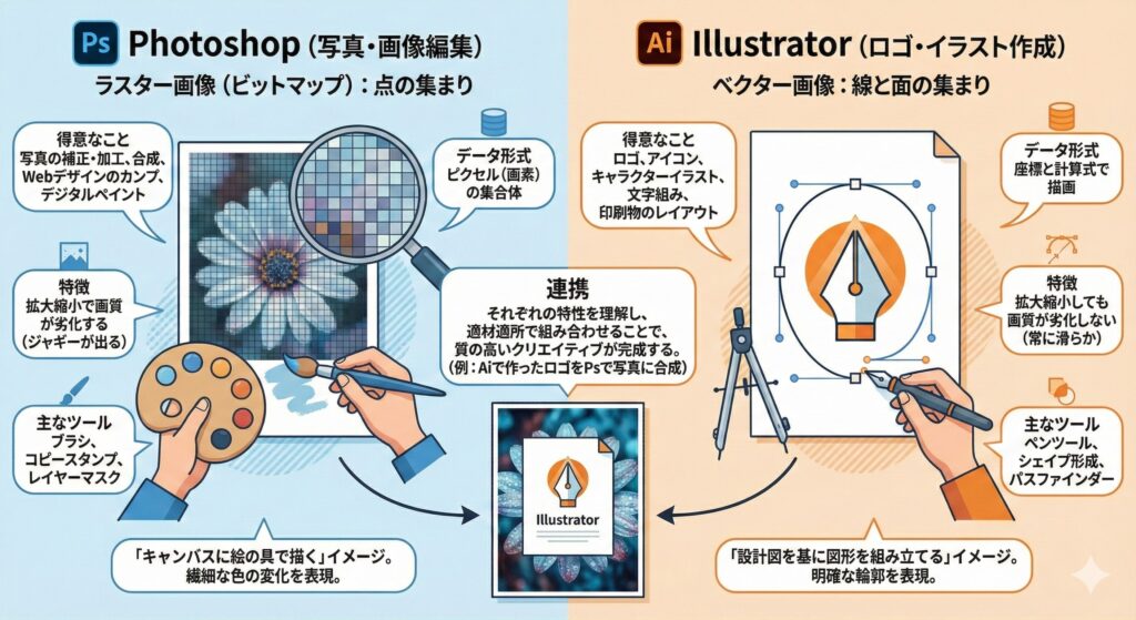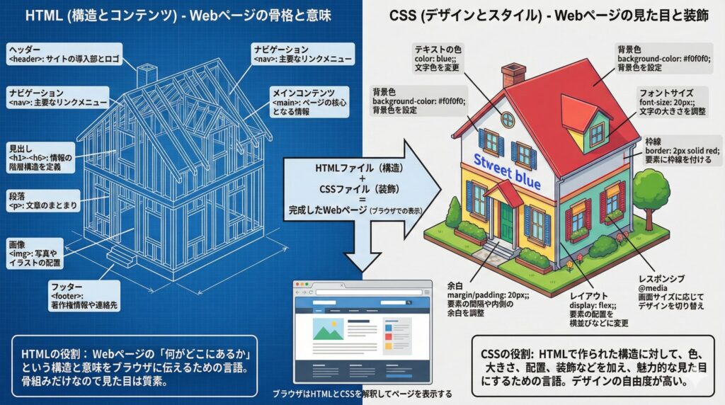 HTML/CSSはパソコンのソフトではなく、Webサイトの制作に使われる言語のことです。HTMLは文書の構造、CSSは文書のデザインを指定するときに使われます。