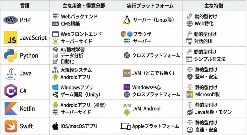 スマートフォンアプリの開発であれば、JavaやC#、Kotlin、Swiftなどでしょうか。