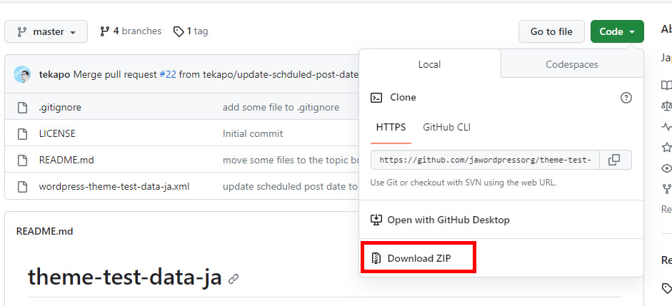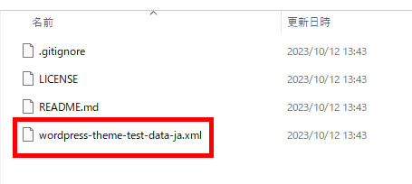 ダミーデータの本体となるのが「wordpress-theme-test-data-ja.xml」というファイルです。このファイルが含まれているか確認しましょう。