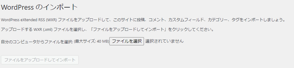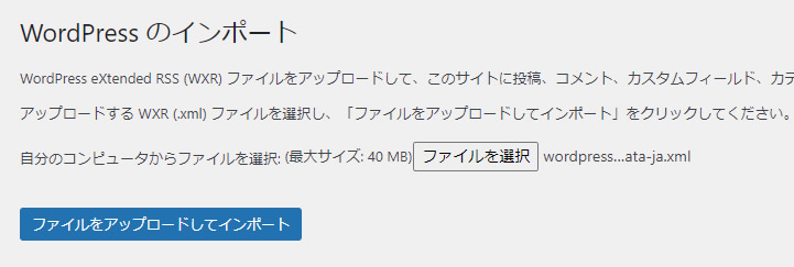 「WordPressのインポート」という画面が表示されるので、「ファイルを選択」ボタンから先ほどの「wordpress-theme-test-data-ja.xml」を選択します。