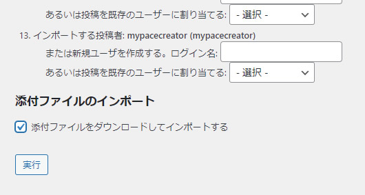 画面いっぱいにたくさんの情報が表示されますが、下までスクロールして「添付ファイルをダウンロードしてインポートする」ボタンにチェックを入れてから「実行」ボタンをクリックします。