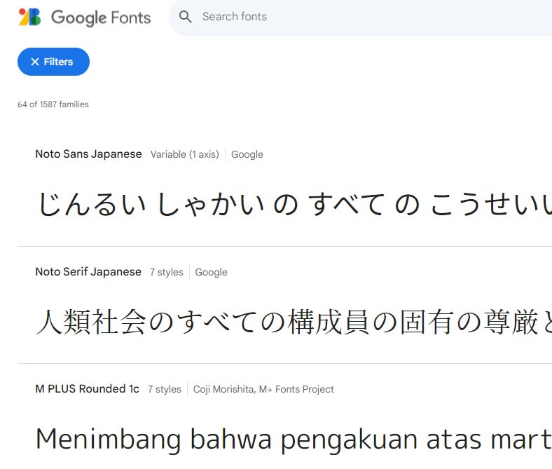 そうすると、上の画像のように、日本語に対応したWebフォントの一覧が表示されます。2024年1月時点では64書体から選択できるようです。