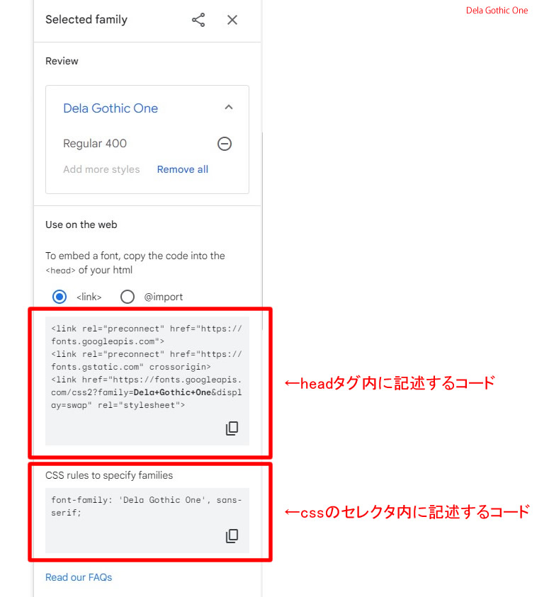 もう少し詳しく説明すると、「headタグ内に記述するコード」により、その記述が書かれているWebページで指定したWebフォントが使用できるようになります。