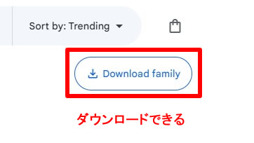 フォントページの右上にあるボタン「Download family」をクリックしてみましょう。