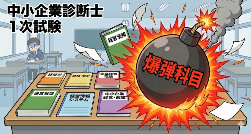 中小企業診断士の1次試験は全部で7科目あるのですが、特定の年に特定の科目がやたら難しくなる「爆弾」が仕掛けられていることがあります。そのため中小企業診断士の1次試験には「できるだけ7科目全部受験する」という定石があります。これは1次試験で不合格にならないための、リスク分散でもあります。